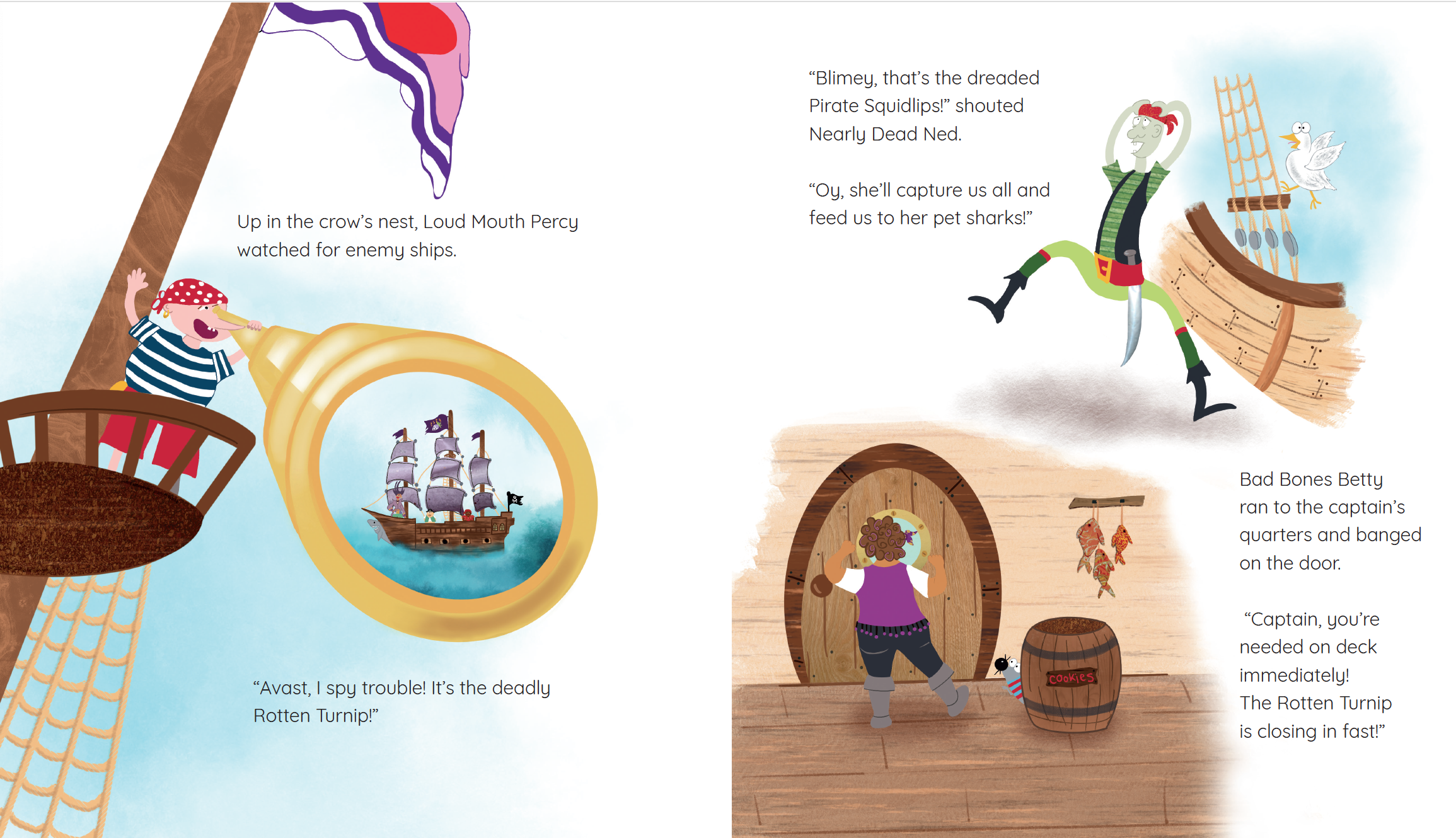 Alone In his cabin, Pirate Glitterbeard sprinkled pink glitter onto his beard and put on his finest pink skirt! He loves everything pink and glittery. Will his crew rebel when they find out? In this rollicking sea tale, the captain and his quirky crew journey to find their treasure – the Wikkie-Tikkie’s legendary meat pies. But, argh, evil Pirate Squidlips and her ship, The Rotten Turnip draw near…Written and illustrated by Larissa & Oksanna Crawley
