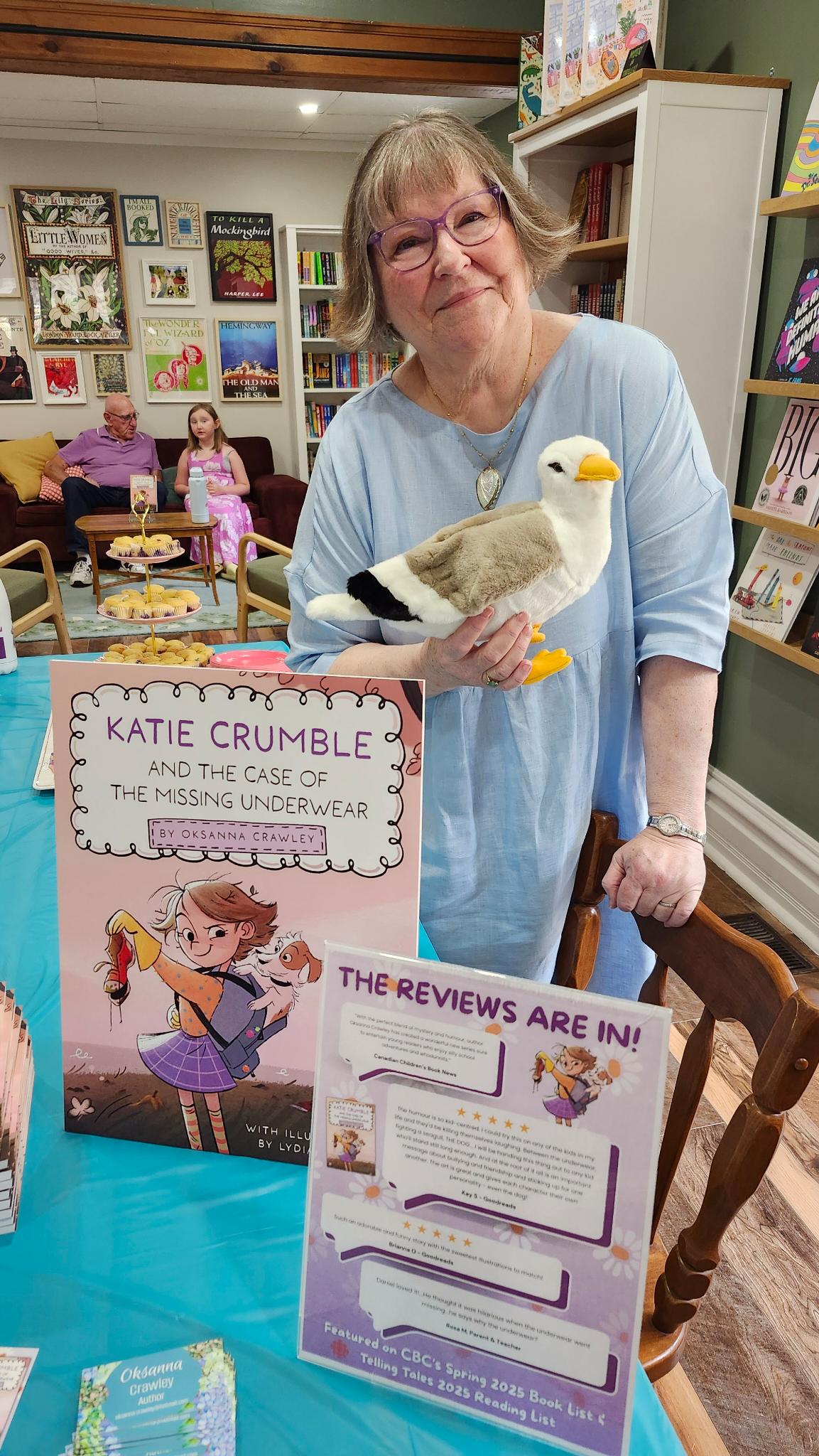 Why am I holding a seagull? The setting of my chapter book, Katie Crumble and the Case of the Missing Underwear, is the fictional town of Misty-by-the-Sea. And, there are lots of seagulls! Katie is a quirky 9-year old who loves to solve mysteries with her BFF, her dog, Aggie McDoogall. The themes of this funny school whodunit are mystery, friendship and bullying. We had a wonderful time at the book launch held at the lovely Word Squirrel Books in Kincardine. This book will be part of a series! Katie Crumble 2 is already in production at Plumleaf Press and I’m working on a third! If you’ve purchased a copy, please leave a review wherever you bought the book. I’m also on Goodreads.